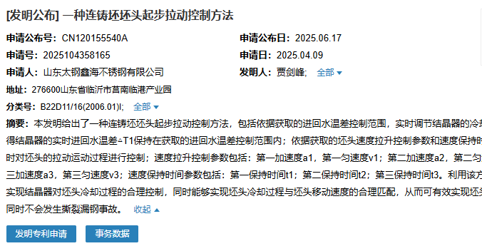 時間:06/17/2025 07:52:552025年6月17日,山東太鋼鑫海不銹鋼有限公司成功申請一項名為“一種連鑄坯坯頭起步拉動控制方法”專利,申請公布號為CN120155540A,申請日期為2025年4月9日。