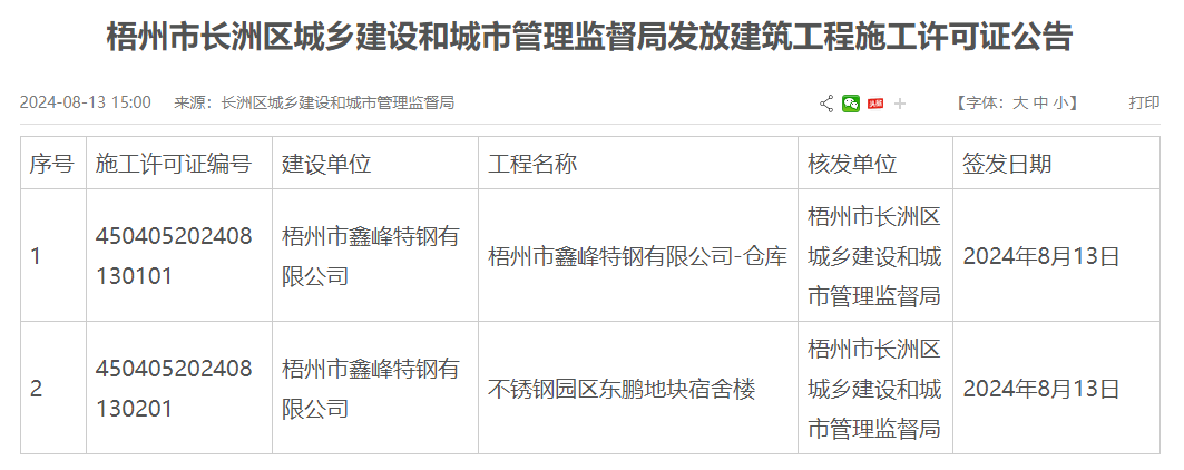 時間:08/16/2024 08:37:528月13日,梧州市鑫峰特鋼有限公司不銹鋼倉庫及不銹鋼園區東鵬地塊宿舍樓建設獲建筑工程施工許可證。