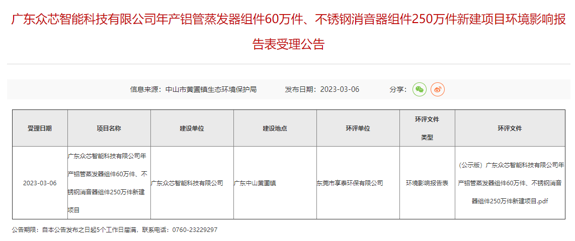 眾芯智能科技公司年產(chǎn)250萬(wàn)件不銹鋼消音器組件新建項(xiàng)目環(huán)評(píng)受理